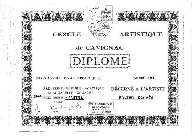 DiplĂ´me du Cercle artistique de Cavignac (33) en 1992