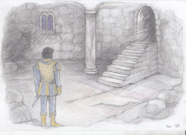 Kenneth postupujici zkouškám v hradě LochlevenKresba tužkou, 2019